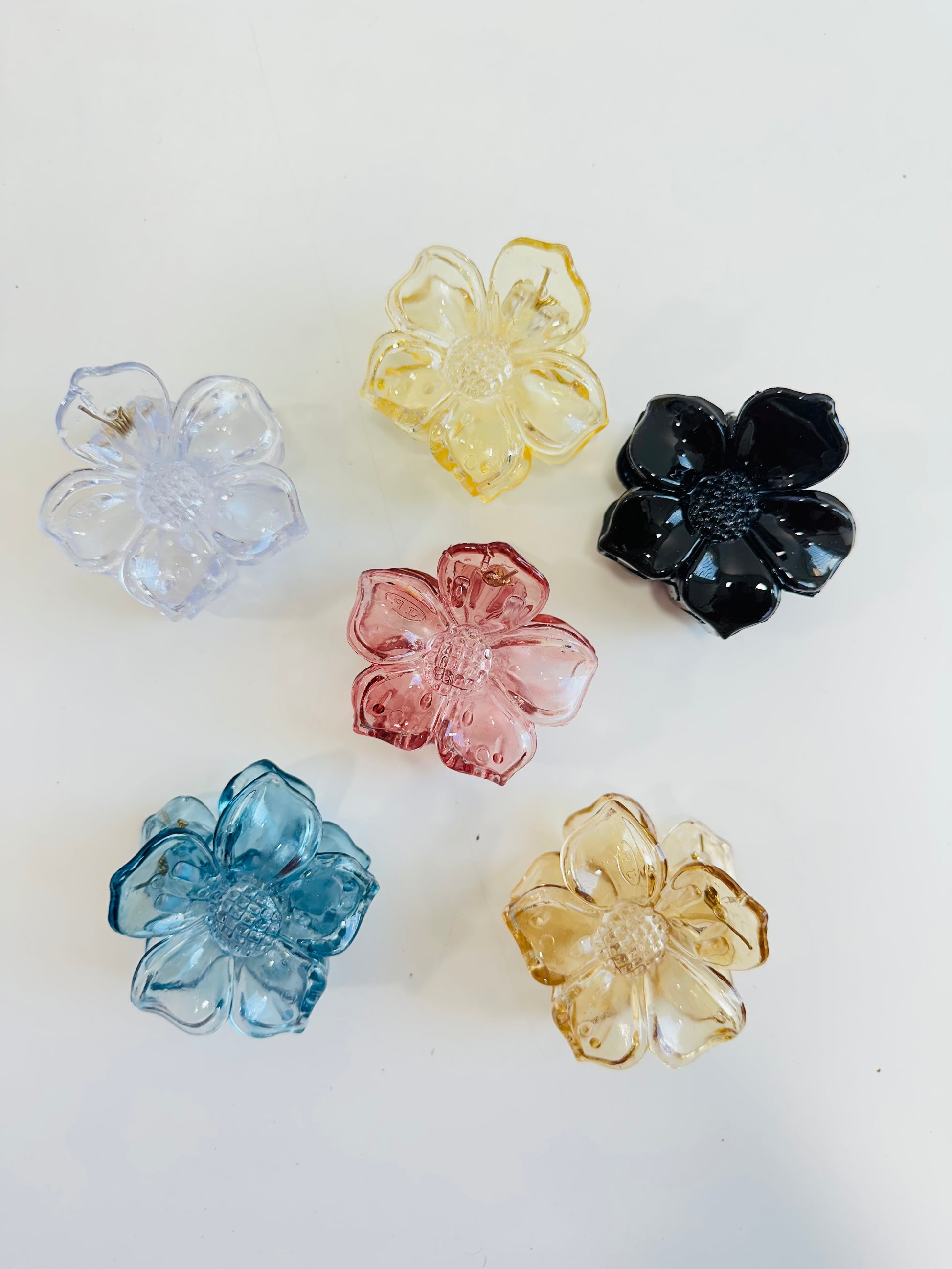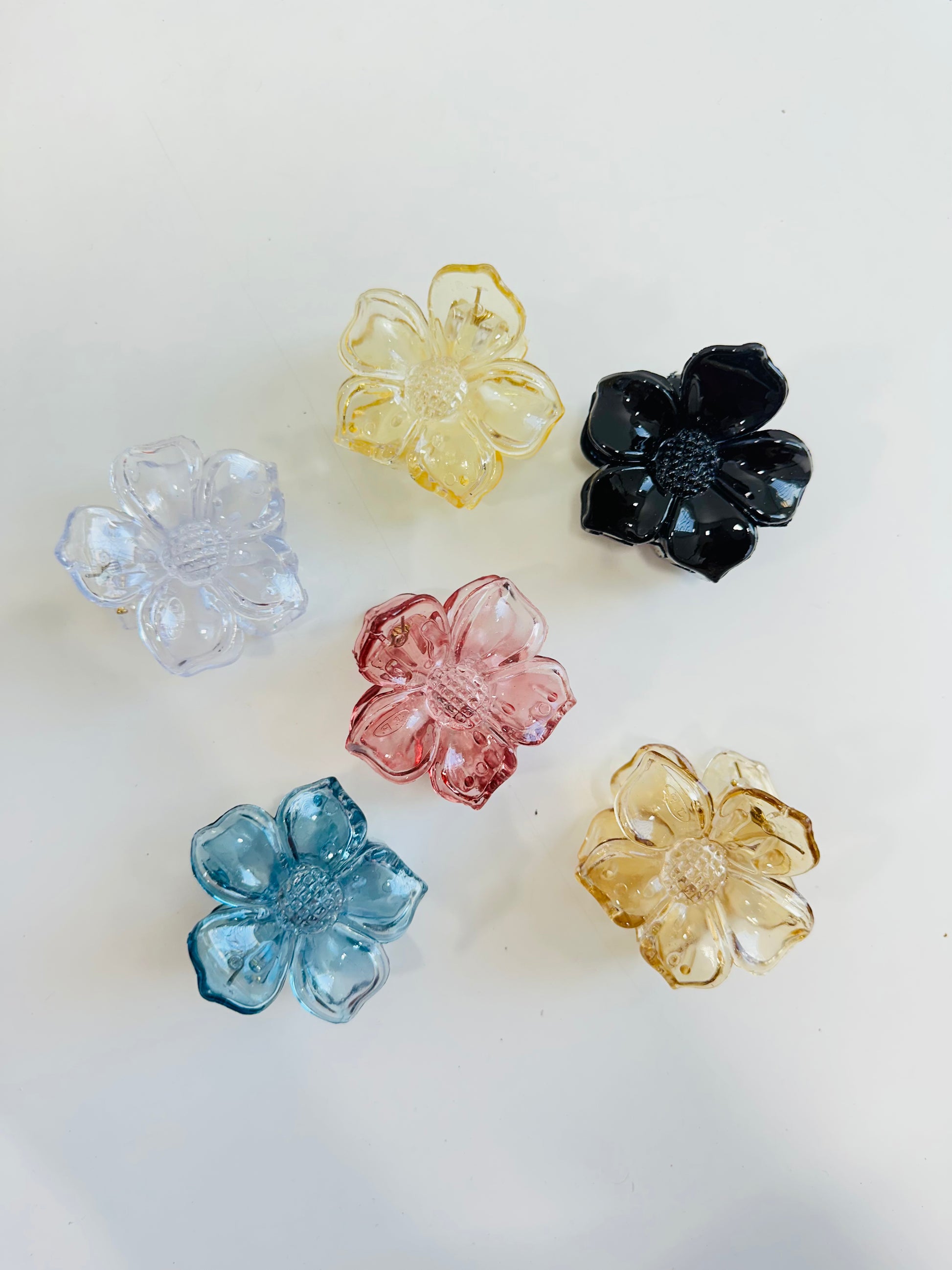 This glass-colored flower hair claw clip offers a stylish and secure way to keep your hair in place. Crafted with a translucent finish, it adds a subtle yet elegant touch to any hairstyle. Its sturdy claw design ensures firm grip without damaging your hair, making it ideal for both casual and formal occasions. Perfect for those seeking a blend of functionality and refined aesthetics in hair accessories.