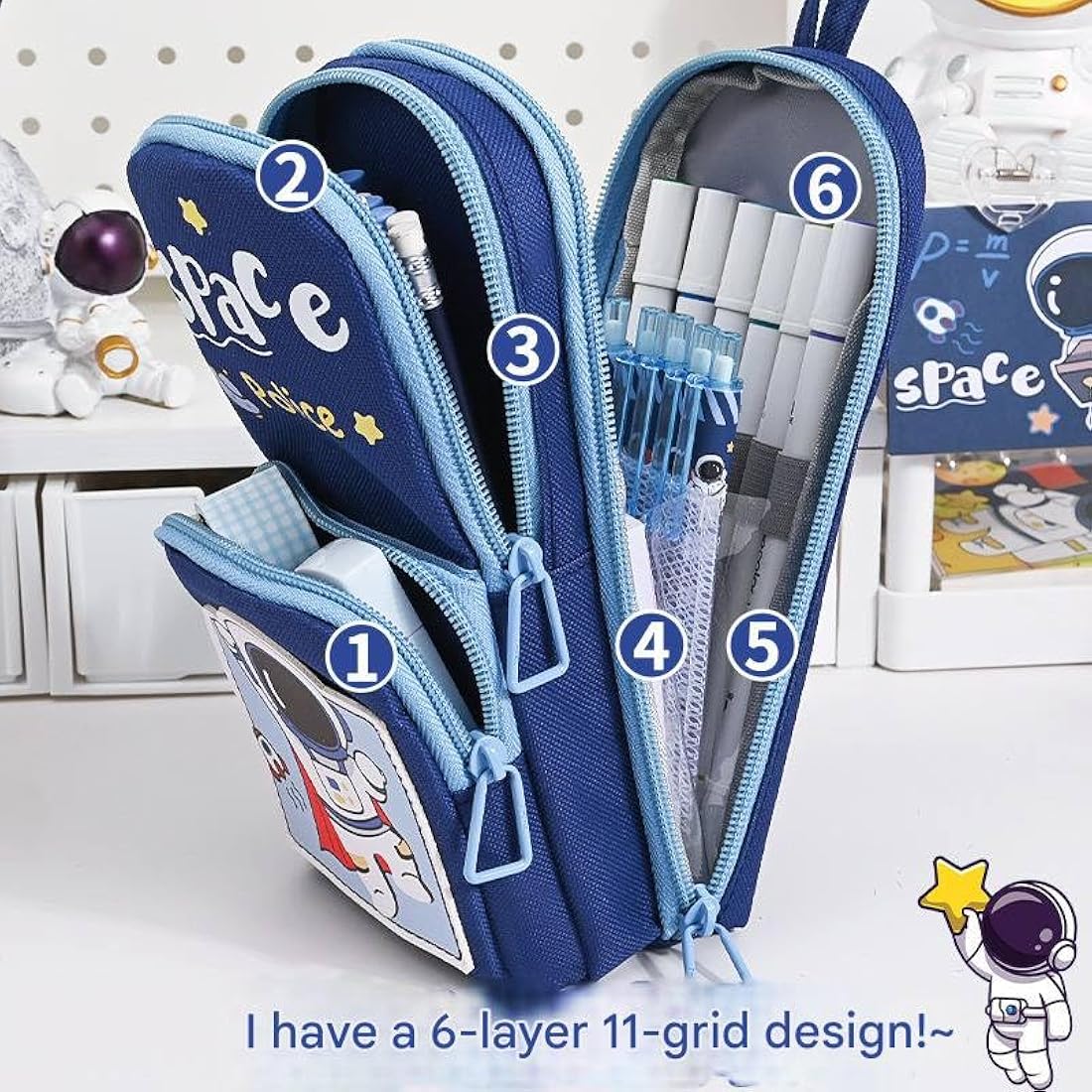 Space explorer meets desk organization with this three-compartment pencil pouch featuring a charming spaceman design. Perfect for students, creatives, and stationery enthusiasts, the triple-zip layout keeps pens, markers, and supplies neatly separated and instantly accessible. Durable construction and playful kawaii aesthetics make it an ideal gift for anyone who loves cosmic-themed desk accessories. Compact enough to slip into backpacks or desk drawers, yet spacious enough to hold your essential writing tools and small items.
