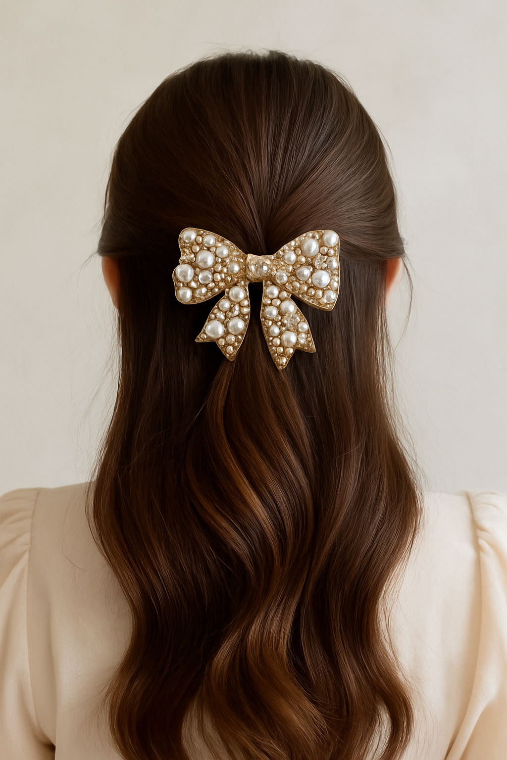 Elevate your elegance with this pearl bow metal hair pin, designed for luxury wedding and party wear. Crafted with a delicate metal frame and adorned with lustrous pearls, it offers a refined touch to any hairstyle. Perfect for securing your hair with grace, this pin enhances your look with subtle sophistication suited for special occasions.